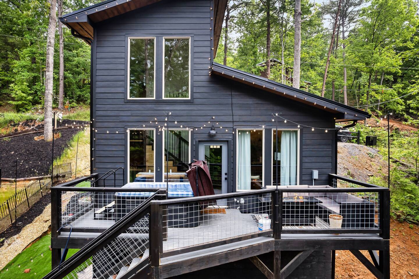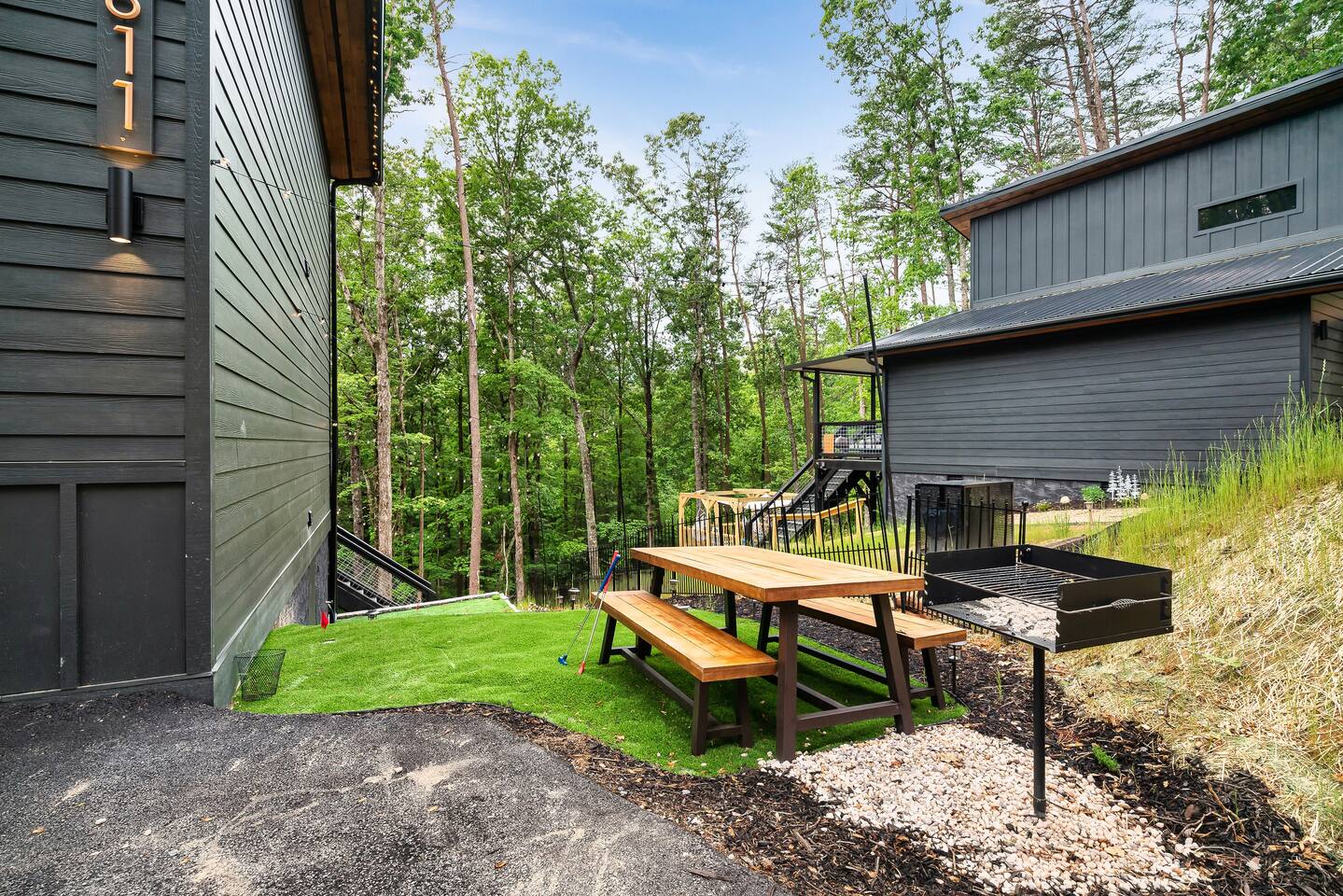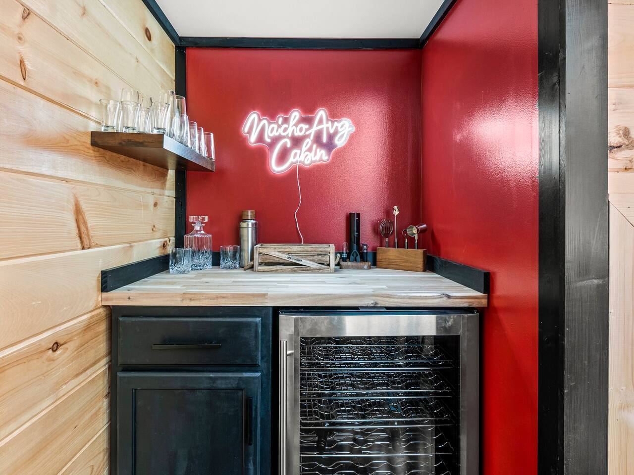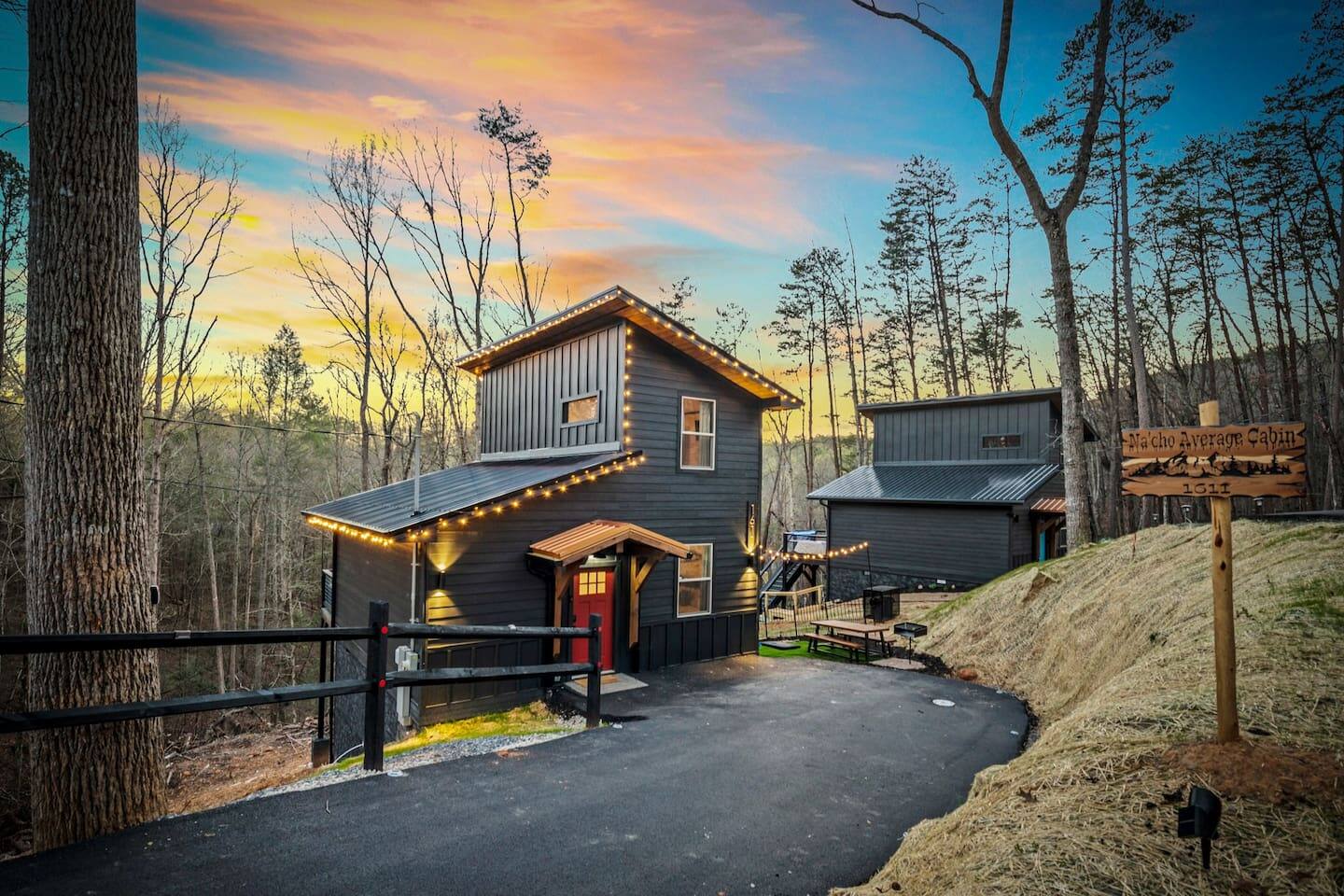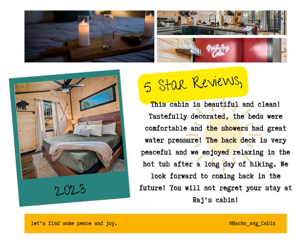 🌟 Na'Cho Average Cabin — Luxury Modern Cabin near Dollywood with Hot Tub, Mini Bar, Fire Pit, and Amazing Views! 🌟 ♦ 5 Miles to Top Attractions! Prime Location in Sevierville! ♥ Welcome to Na'Cho Average Cabin, your unforgettable Smoky Mountain getaway! This brand-new 2-bedroom, 2-bathroom luxury cabin blends modern design with cozy mountain charm, offering spectacular forest and mountain views and incredible amenities. Located just 5 miles from Dollywood, The Island in Pigeon Forge, and countless Smoky Mountain attractions, our Sevierville cabin rental is perfectly situated for family adventures, romantic getaways, and group trips! After hiking scenic trails in Great Smoky Mountains National Park, relax in your private 6-person hot tub, toast marshmallows at the modern gas fire pit, or sip cocktails at your very own mini bar with stunning forest views. ♦ Easy Access! Our cabin is located on a fully paved, lit driveway — no steep mountain roads to worry about! ♦ You can't miss us: Our cabin is uniquely lit with bright rooftop lights, making evening arrivals easy and magical. 🛌 The Space: ✔ 2 Large Bedrooms — Each with a KING bed + Queen sleeper sofa (Sleeps 6 total) ✔ Smart TVs in every room + Superfast Wi-Fi (1.2 GBPS!) ✔ 2 Modern Bathrooms — One with a soaking tub, one with a walk-in shower ✔ Fully Stocked Kitchen — K-Cups, coffee, crockpot, instant pot, blender, cookware, spices, and more! ✔ Coffee Bar with Keurig machine ✔ Retro Mini Bar with neon lighting, wine glasses, shot glasses, mini fridge & decanter set ✔ Board Games for family fun nights ✔ Washer and Dryer for your convenience ✔ Outdoor Mini-Golf Course for kids and adults ✔ Large Private Deck with forest and mountain views ✔ Oversized Hot Tub perfect for soaking after a day of exploring ✔ Outdoor Lounge Sofas + Fire Pit for cozy evenings under the stars ✔ Charcoal BBQ Grill + Picnic Table (BYO Charcoal) 🍳 Fully Stocked Kitchen: Cook up a storm with everything you need: K-cups, ground coffee, creamers, crockpot, instant pot, blender, pots, pans, dishes, utensils, spices, cooking spray, and more. 🛏️ Spacious Bedrooms: Two luxurious King Suites with modern, cozy decor, smart Roku TVs, and large windows to soak in the natural light and forest views. 🛁 Spa-Inspired Bathrooms: The downstairs bathroom features a relaxing soaking tub, while the upstairs suite offers a walk-in rainfall shower — the perfect spa experience after a long hike. 📺 Modern Lounge Area: Open-concept living space with 55” Roku TV, Queen sleeper sofa, and direct access to the vibrant mini bar for late-night fun. 🍹 Retro Mini-Bar: Chill your favorite drinks in the mini fridge, toast with stylish wine and shot glasses, and enjoy hip neon vibes overlooking the forest. 🌲 Outdoor Oasis: Unwind in the large hot tub, cozy up by the fire pit, or challenge your group to a game of mini-golf under the twinkling outdoor lights. 🎯 Fun Extras: Outdoor lighting for beautiful night photos Outdoor mini-golf set Fast Wi-Fi for streaming and remote work Paved and easily accessible driveway — no 4WD needed! 🎢 Perfect for: ✅ Family vacations ✅ Couples’ retreats ✅ Friends’ getaways ✅ Romantic honeymoons ✅ Dollywood trips ✅ Adventures to Smoky Mountain National Park ★☆ Book your stay today at Na'Cho Average Cabin and create unforgettable memories in Sevierville! ☆★