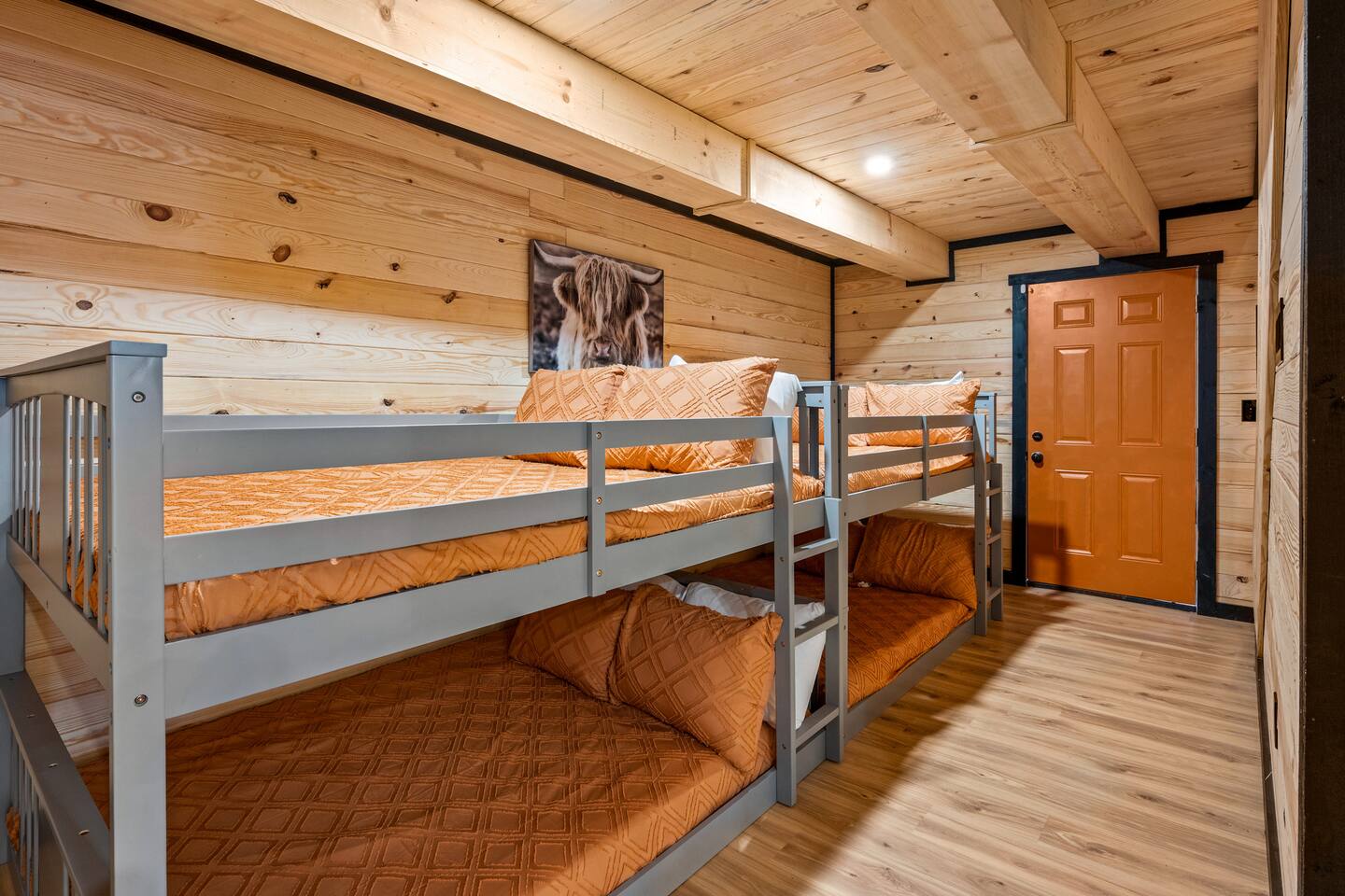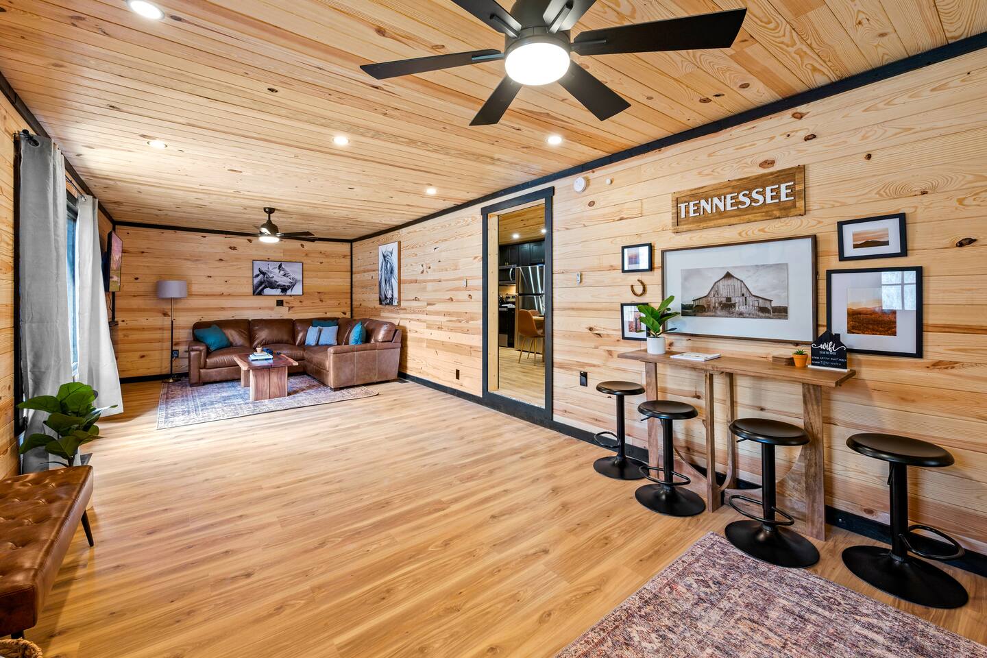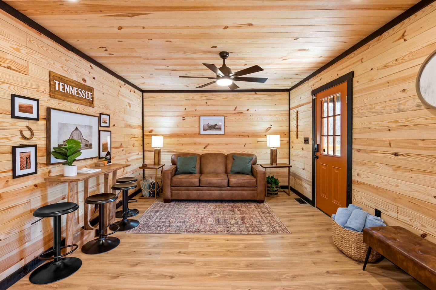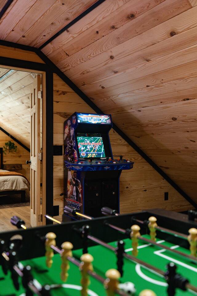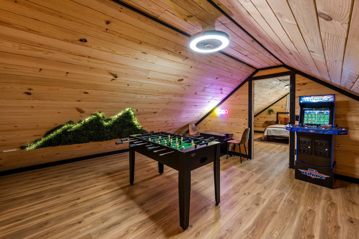 ♦ LOCATION LOCATION LOCATION!!! Only 4 miles to attractions in Pigeon Forge!♦ ♥ Welcome to Little Roost Cabin! Enjoy our Brand new Modern Luxury cabin with amazing views and various amenities. ♥ ♦ There is so much to do in this cabin, but if you decide to venture out to Dollywood, The Islands and many attractions are only a 4 mile trip! Enjoy the steamy hot tub that can accommodate 8 people after a fun day of hiking to the Smoky Mountain National Park ♦ This cabin is located on paved driveway that is very easy to drive on. The road to the cabin is fully paved and lit with Asphalt lighting making it SUPER convenient to navigate. Ours is the only cabin in the ENTIRE area that has amazing lights which makes it hard to miss. The Space: ☀ 3 bedrooms and 1 open bunk bedroom: 2 king-size bed, 1 full sized bed, 1 Twin size, 4 full-size bunk beds, 1 queen-size sleeper sofa. Can sleep total of 12 people comfortably. ☀ All the rooms have TVs with Fast Wifi ☀ 3 Bathrooms: 1 Bathroom downstairs has a tub, and the other has a walk-in shower. 1 Bathroom upstairs has a walk-in shower ☀ Well-stocked kitchen: Coffee maker, k cups, assortment of spices, croc pot, instant pot, kettle, blender, frying pans, plates, cups, and silverware ☀ Coffee maker with K-cups ☀ Salt, pepper, and cooking oil are provided ☀ Warm and inviting lounge with large Roku TV ☀ Amazing Game room with multiple arcade games, Foosball, Air Hockey and Darts ☀ A convenient laundry with both a washer and dryer ☀ Outdoor PuttPutt, Disc Golf and Tether Ball for adults and kids to enjoy ☀ Outdoor deck with Mountain views and Amazing Horse views overseeing Big Rock Dude Ranch ☀ Large outdoor 8 person hot tub to relax and enjoy the view ☀ Outdoor wood fire pit and Charcoal BBQ ☀ High-speed WiFi throughout the home ☆☆ KITCHEN ☆☆ The Kitchen comes fully stocked with K-cups, Coffee maker, Assortment of Spices, Croc pot, Instant pot, Kettle, Blender, Frying pans, Plates, Cups, and Silverware. ☆☆ BEDROOMS ☆☆ This two-level cabin offers 2 spacious KING Bedrooms. The third bedroom has a full sized bed and 1 Twin size bed. The open Bunk bedroom comes with 4 FULL size Bunk beds, each featuring a modern and homely finish. The main comes with a luxurious king-size bed, a 40 inch Roku TV, and French Doors presenting plenty of natural light with access to the Back Deck The second bedroom has a king-size bed and the third bedroom has 2 beds (a full sized bed and twin size bed), respectively. A 40 inch Roku TV, cozy decor, and enough storage for your belongings. The Bunk room has 4 Full size bunk beds with their own Bathroom. This room does not have a private door and shares the stairs going upstairs ☆☆ BATHROOMS ☆☆ Three bathrooms are thoughtfully stocked with everything you may need for your stay, including luxury essentials and bath towels. The 2 bathroom downstairs have a tub and walk-in shower while the upstairs bathroom has a walk-in shower. So you can choose between a quick shower or a long soak after an active day at the National Park. ☆☆ LIVING AREA ☆☆ The living area is complete with a modern Queen Sleeper sofa and comfortable seating options and direct open access to the Minibar. It also features a 55 inch Roku TV paired with high-speed internet for your entertainment. So grab a drink a drink, sit back and enjoy your favorite show or movie. ☆☆ GAME ROOM☆☆ The game room comes with arcades such as PacMan, NFL Football and hundred other games. We also have Foosball, Air Hockey, and darts ☆☆ OUTSIDE SPACE AND FIRE PIT☆☆ Step out into the deck to be welcomed by a large 6 person hot tub and amazing lounge area with fire pit. Are you tired after a long day of hiking? Jump into the hot tub with amazing jetted spas! Want to keep it classy? Enjoy the amazing view of the outdoors all while relaxing on the lounge sofa. Grab a drink and enjoy roasting marshmallows!!! ☆☆ OUTSIDE GAMES AND BBQ ☆☆ The cabin has an amazing Fire-pit with stumps and chair seating. We provide activities such as PuttPutt, Disc Golf, Tether Ball for both Adults and Kids to enjoy! The putt putt sticks are 17 inches and extend to 32 inches. There is an outdoor charcoal BBQ and all utensils required for using the BBQ. Guests should BYO Charcoal. The entire outdoors area is fitted with beautiful lighting all throughout creating amazing picturesque moments. ★☆ Book Today & Let Us Take Care Of You In Pigeon Forge! ☆★