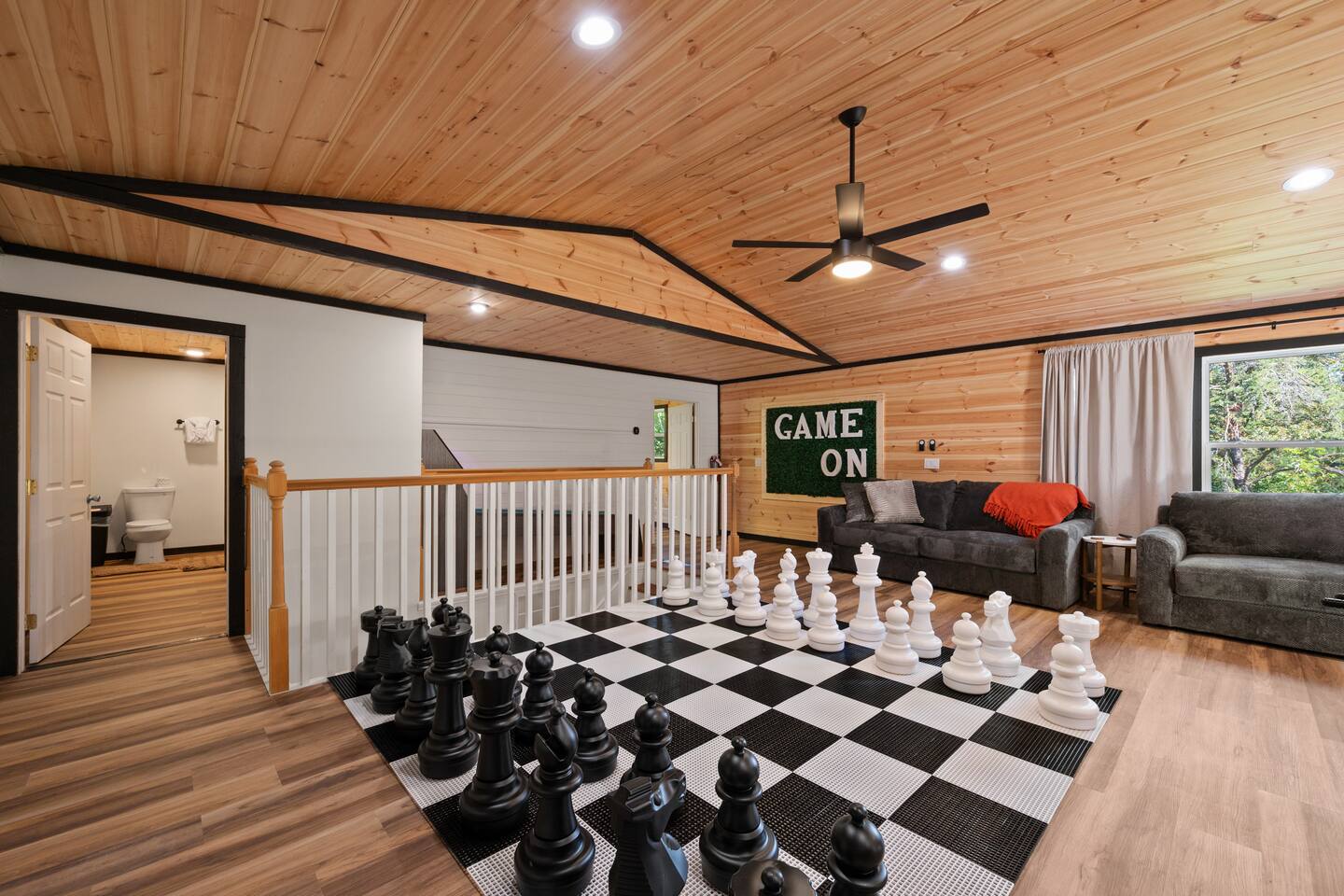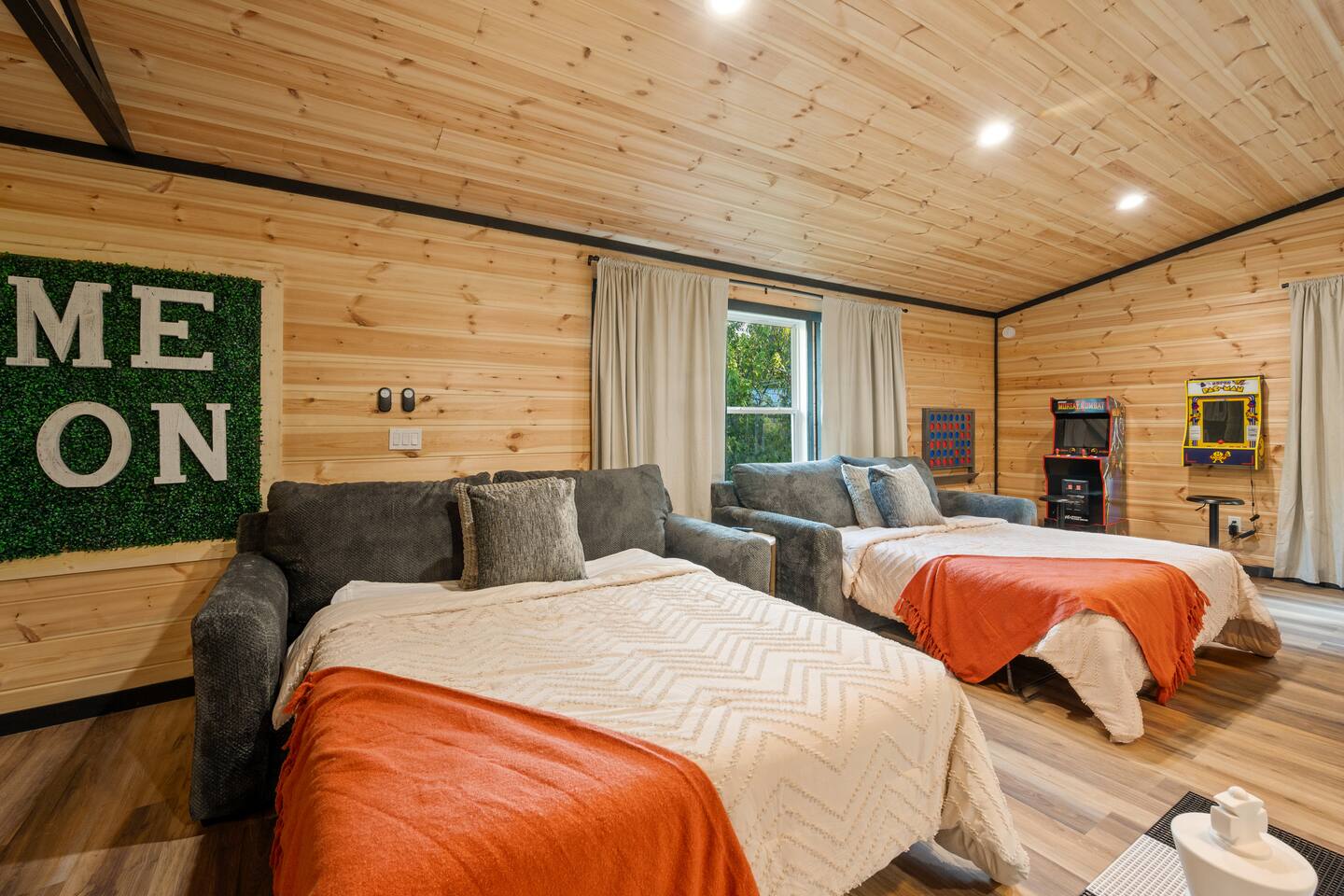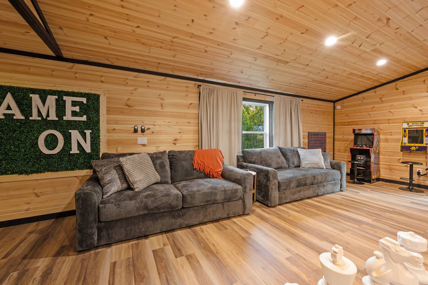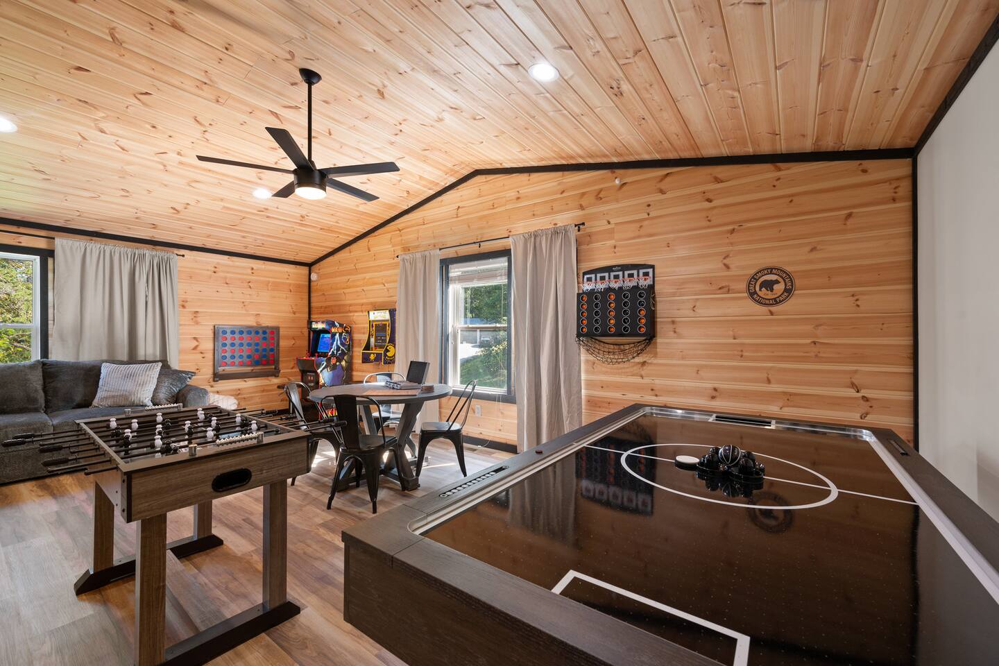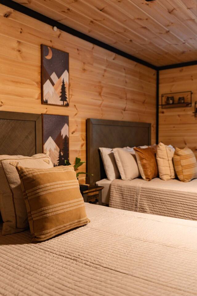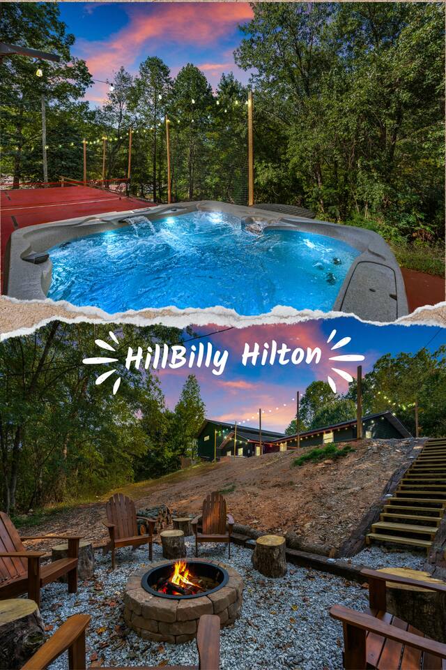 ♦ LOCATION LOCATION LOCATION!!! Only 4 miles to attractions in Pigeon Forge!♦ ♥ Welcome to HillBilly Hilton Cabin! Enjoy our Brand new 4B/3B + Loft Modern Luxury cabin with amazing views and various amenities. ♥ ♦ WE CANNOT ACCOMODATE MORE THAN 16 HUMANS ♦ There is so much to do in this cabin, but if you decide to venture out to Dollywood, The Islands and many attractions are only a 4 mile trip! Enjoy the heated indoor swimming pool and steamy hot tub that can accommodate 8 people after a fun day of hiking to the Smoky Mountain National Park ♦ This cabin is located on paved road that is very easy to drive on. The Space: ☀ 4 Large bedrooms + Loft: 2 king-size beds, 2 queen size beds 4 twin-size bunk beds, 2 queen-size sleeper sofas. Can sleep total of 16 people comfortably. ☀ All the rooms have TVs with Fast Wifi ☀ 3 Bathrooms: 2 Bathrooms downstairs. 1 has a tub shower combo, and the other has a walk-in shower. 1 Bathroom upstairs has a tub shower combo ☀ Heated indoor swimming pool ☀ Large backyard with a pickleball court, Disc golfs, firepit, Hot tub and Charcoal BBQ ☀ Theater room with 9 recliner seats ☀ Amazing Game room with Human size chess, multiple arcade games, Skeeball, Air Hockey and Foosball ☀ Warm and inviting lounge with large Roku TV ☀ A convenient laundry with both a washer and dryer ☀ Outdoor Pickleball and Disc Golf for adults and kids to enjoy ☀ Outdoor seasonal Wooded views ☀ Large outdoor 6 to 8 person hot tub to relax and enjoy the view ☀ Outdoor wood burning fire pit and Charcoal BBQ ☀ High-speed WiFi throughout the home ☆☆ KITCHEN ☆☆ ☀ Well-stocked kitchen: Coffee maker, assortment of spices, croc pot, instant pot, kettle, blender, frying pans, plates, cups, and silverware ☀ Coffee maker ☆☆ BEDROOMS ☆☆ This two-level cabin offers 2 spacious KING Bedrooms, master bedroom with 2 QUEEN beds and 1 Bunk room with 4 TWIN size Bunk beds, each featuring a modern and homely finish. The main comes with 2 queen-size bed, a 40 inch Roku TV, and attached bathroom The second and third bedroom have luxurious king-size bed, a 40 inch Roku TV, cozy decor, and enough storage for your belongings. The Bunk room has 4 Twin size bunk beds with their own Bathroom. The game room has 2 queen sleeper sofas. PLEASE NOTE: The game room does not have a private door and shares the stairs coming upstairs ☆☆ BATHROOMS ☆☆ Three bathrooms are thoughtfully stocked with everything you may need for your stay, including luxury essentials and bath towels. The 2 bathroom downstairs have a tub and walk-in shower while the upstairs bathroom has a tub shower. So you can choose between a quick shower or a long soak after an active day at the National Park. ☆☆ LIVING AREA ☆☆ The living area is complete with a large lounge sofa and comfortable seating options and direct open access to the kitchen and dining room. It also features a 55 inch Roku TV paired with high-speed internet for your entertainment. So grab a drink, sit back and enjoy your favorite show or movie. ☆☆ GAME ROOM☆☆ The game room comes with an amazing human sized chess game, arcades such as PacMan, Mortal Kombat and hundred other games. We also have Foosball, skeeball, Air Hockey, and connect4 ☆☆ OUTSIDE SPACE AND FIRE PIT☆☆ Step out into the backyard to be welcomed by an amazing pickleball court, a large 6 to 8 person hot tub and amazing fire pit. Are you tired after a long day of hiking? Jump into the swimming pool or hot tub or BOTH with amazing jetted spas! Want to keep it classy? Enjoy the amazing view of the outdoors all while relaxing by the fire. Grab a drink and enjoy roasting marshmallows!!! ☆☆ OUTSIDE GAMES AND BBQ ☆☆ The cabin has an amazing pickleball court, Disc golf Fire-pit with chairs and stumps for additional seating for both Adults and Kids to enjoy! There is an outdoor charcoal BBQ and all utensils required for using the BBQ. Guests should BYO Charcoal. The entire outdoors area is fitted with beautiful lighting all throughout creating amazing picturesque moments. ★☆ Book Today & Let Us Take Care Of You In Pigeon Forge! ☆★